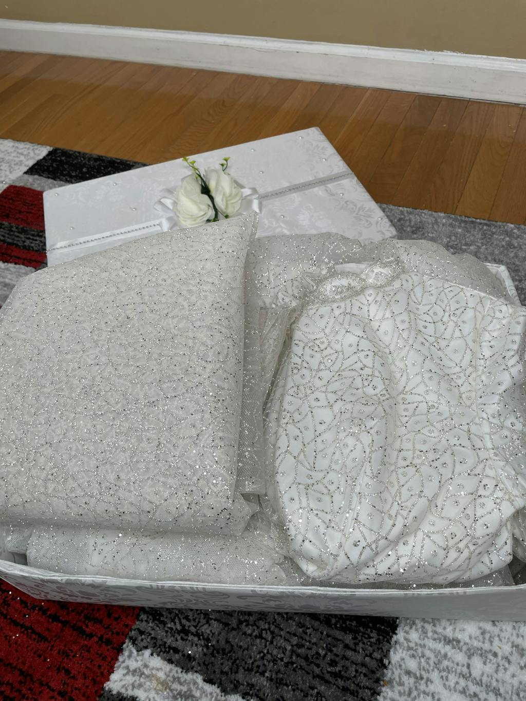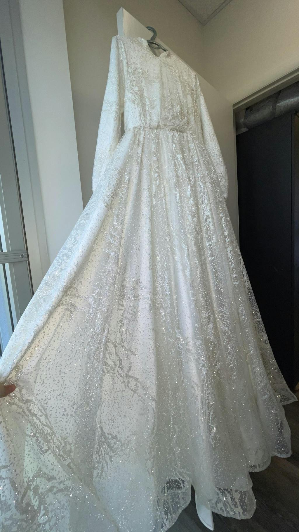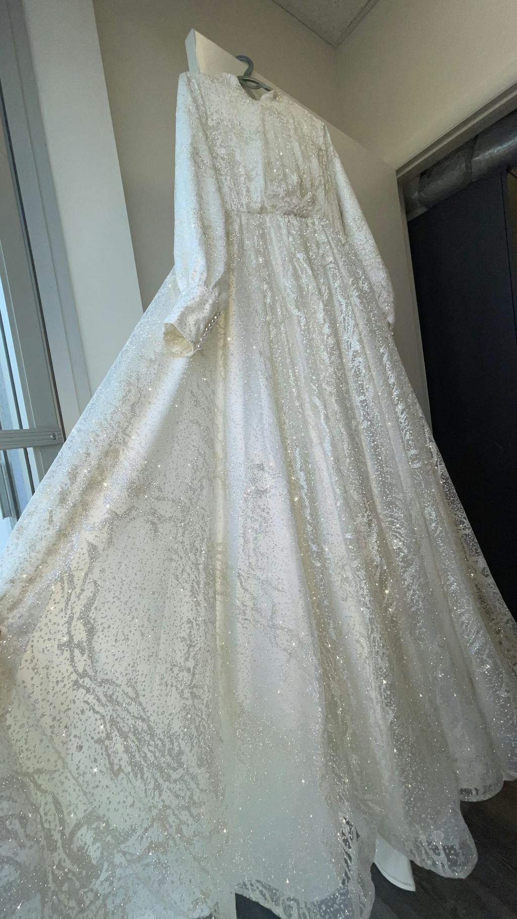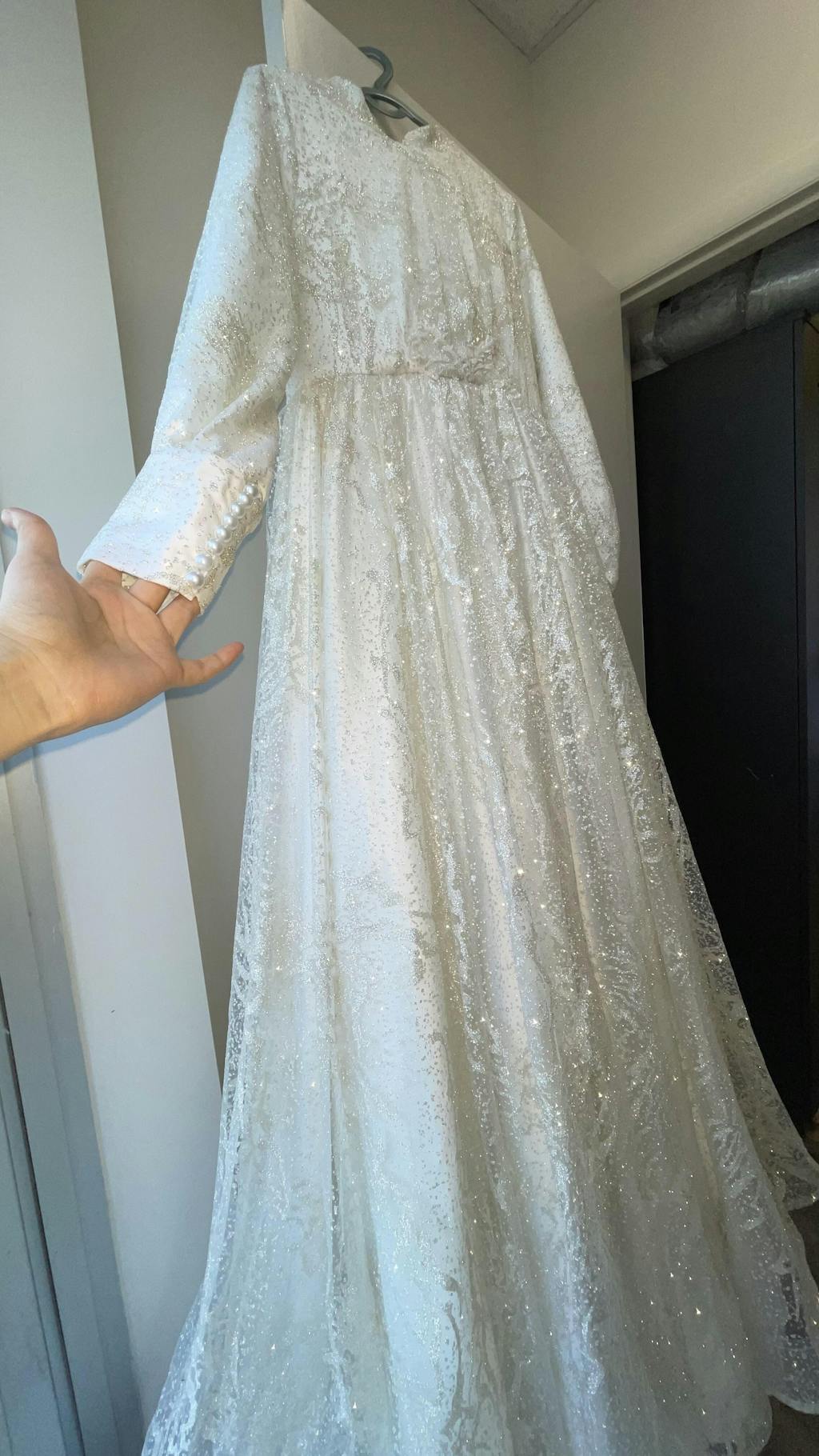 This new white gown is designed specifically for our modest brides, with long sleeves and pearl buttoned cuffs on the ends of the sleeves. It is is made of a silk and embroidered lace fabric combination. The dress has an A-line des with a hidden zipper up to the waist in the back. This white dress has two layers that are sewn together in combination with two-layer sheer silk and decorative lace. Furthermore, for elegancy, the back skirt is 20 cm longer than the front skirt. The lace layer is embellished with floral dice, and the front of the waist is decorated with silver thread and accessorized with small beads and silver colored stones. This gown includes a long, floor length cloak that will keep you perfectly modest.